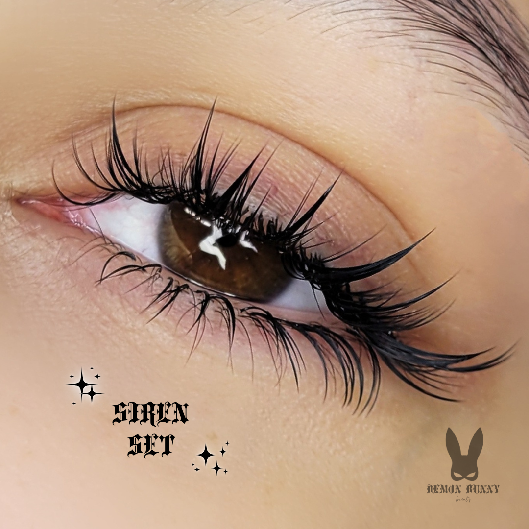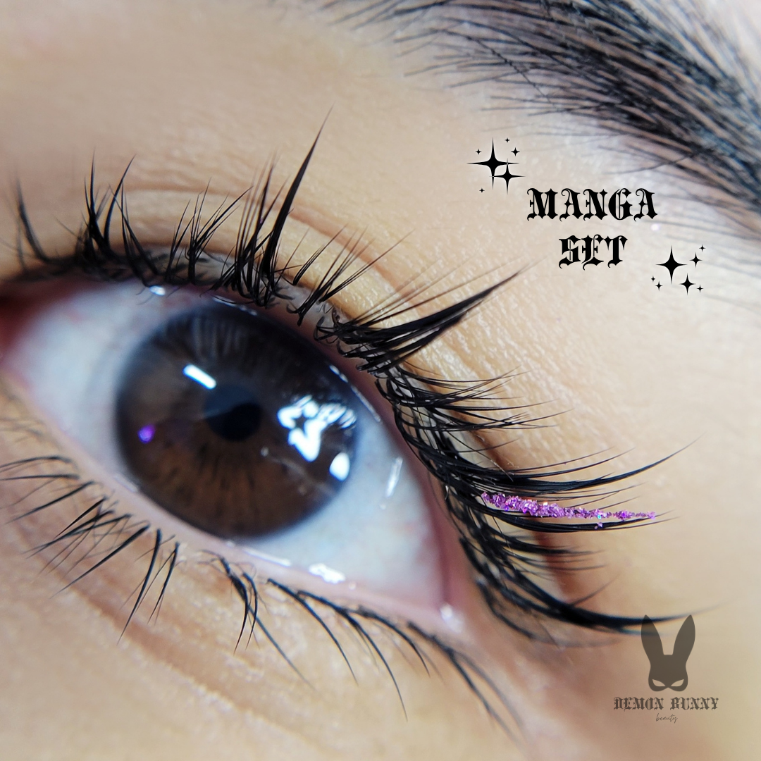 This lash set is flirty like a strip lash! There's Chunky spikes similar to the manga lash style, with fuller volume lashes in between for a darker, dramatic lash line.